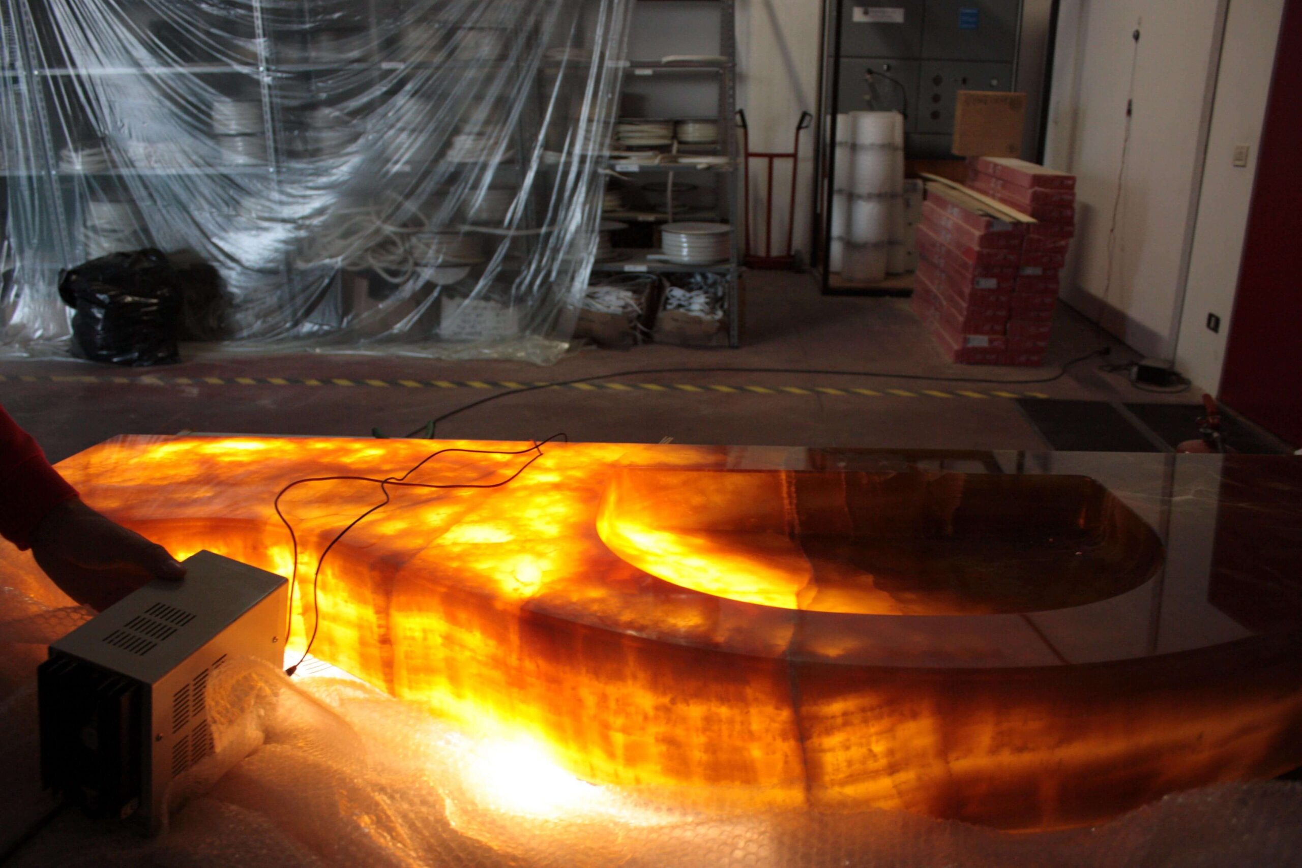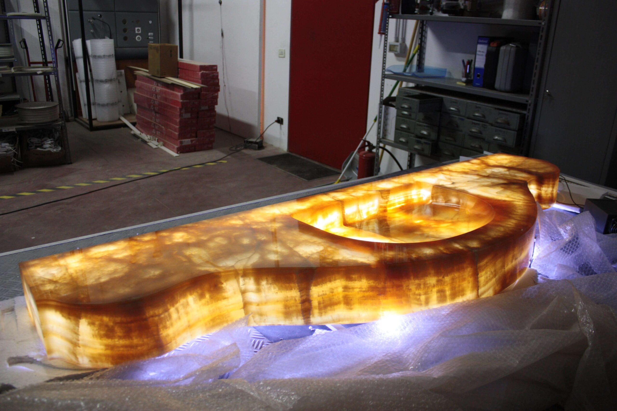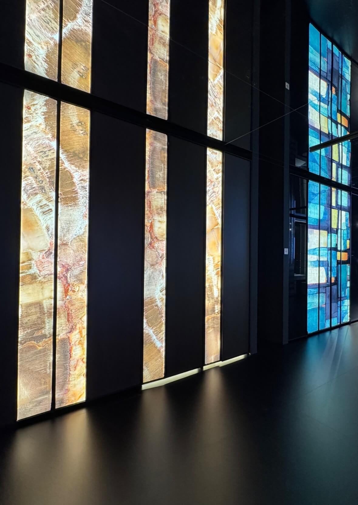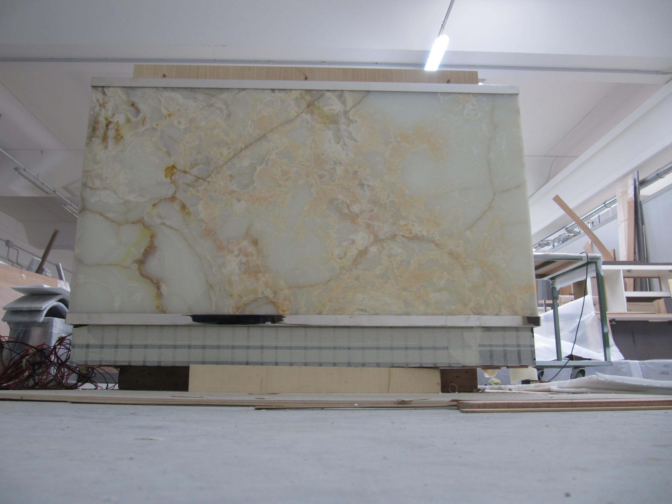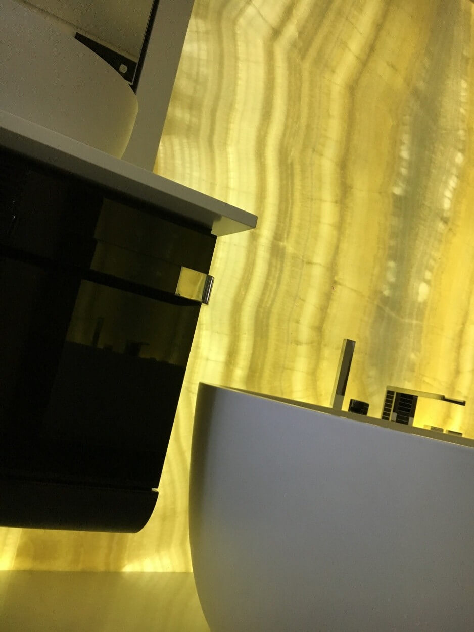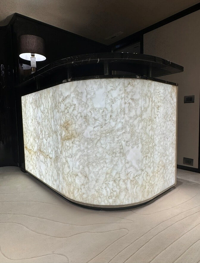Natural and semi-precious stones such as marble, agate, quartz and onyx, or materials such as glass, decorative wallpaper, artistic mosaics, fabrics, resins and the like, are brought to life by light that passes through them, revealing their most hidden soul.