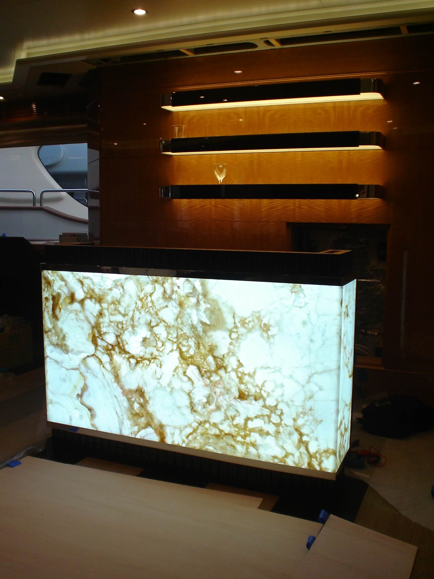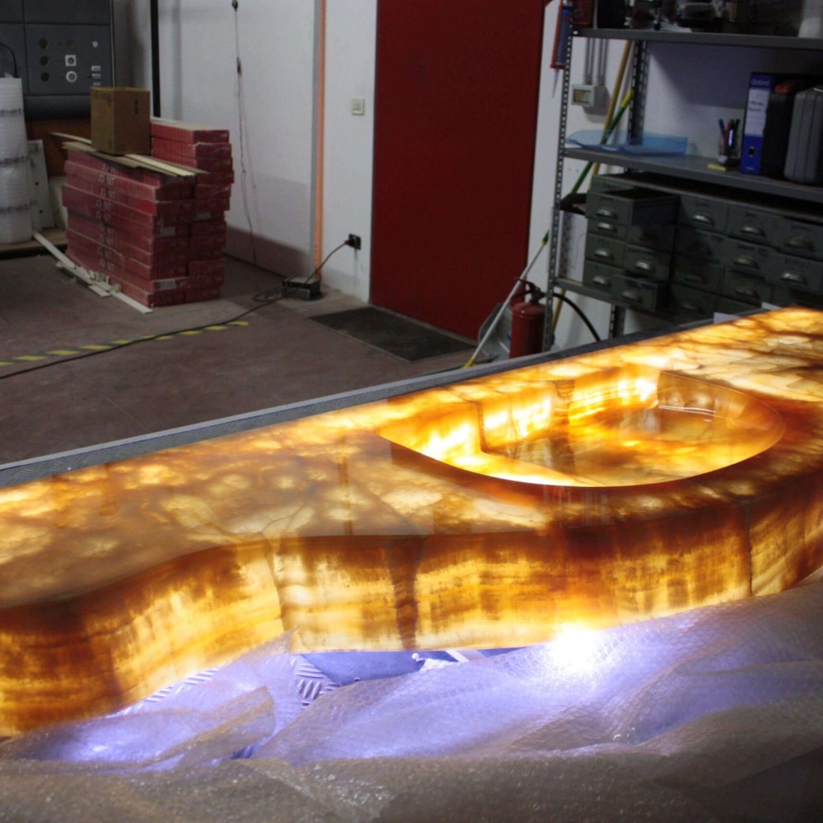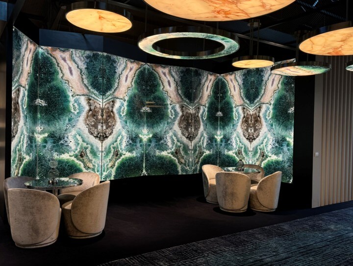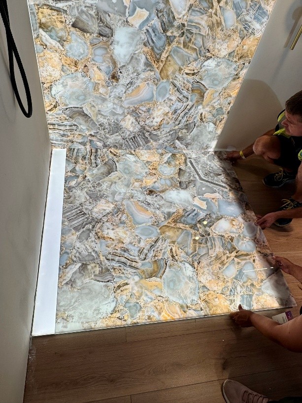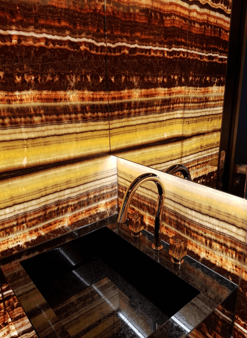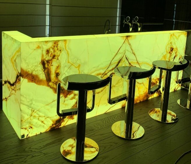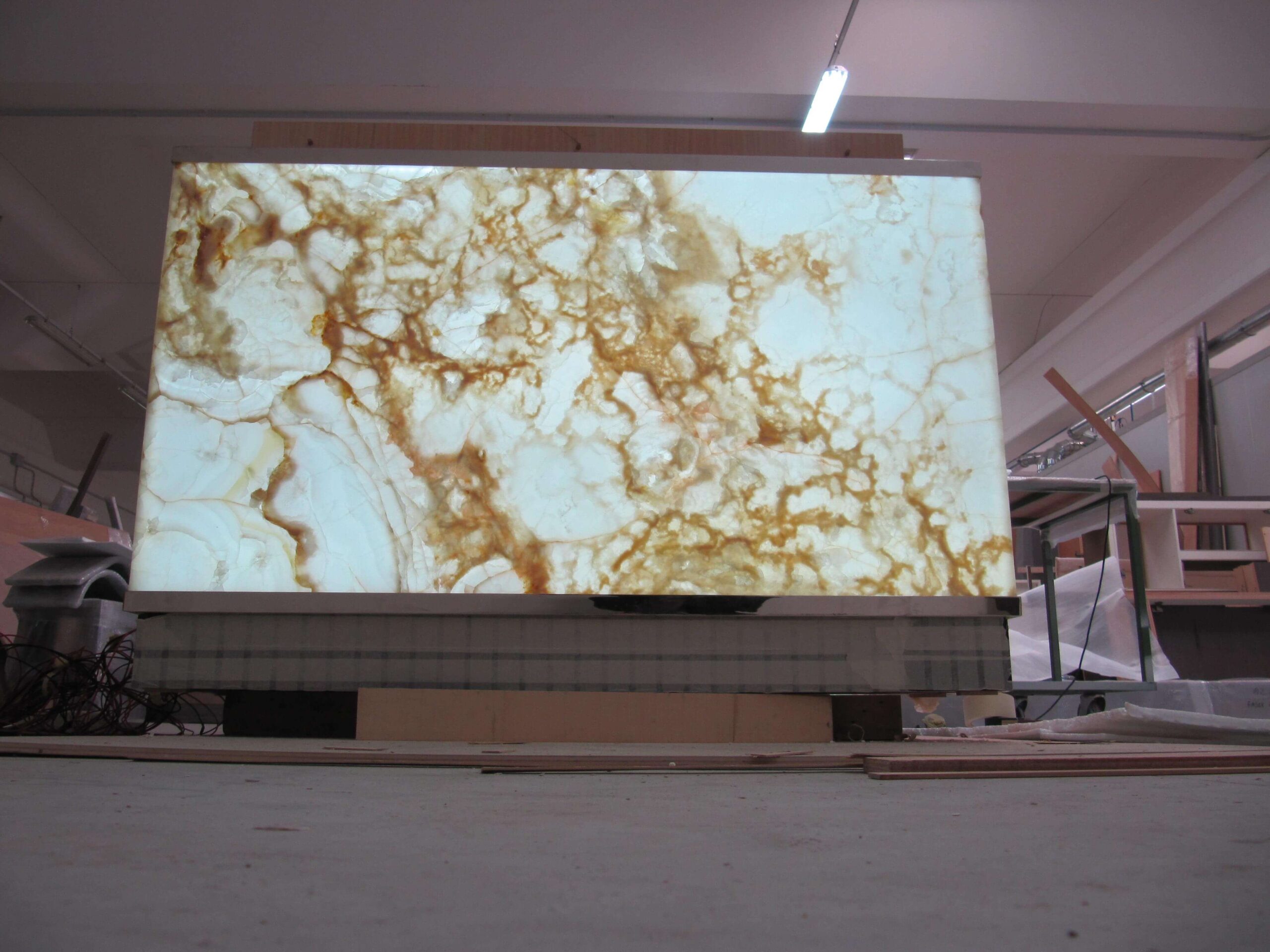 Natural and semi-precious stones such as marble, agate, quartz and onyx, or materials such as glass, decorative wallpaper, artistic mosaics, fabrics, resins and the like, are brought to life by light that passes through them, revealing their most hidden soul.