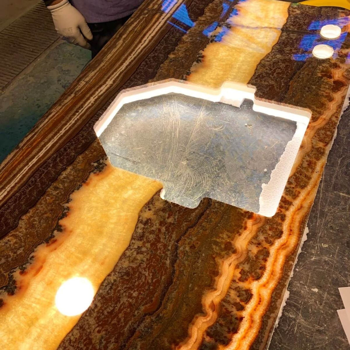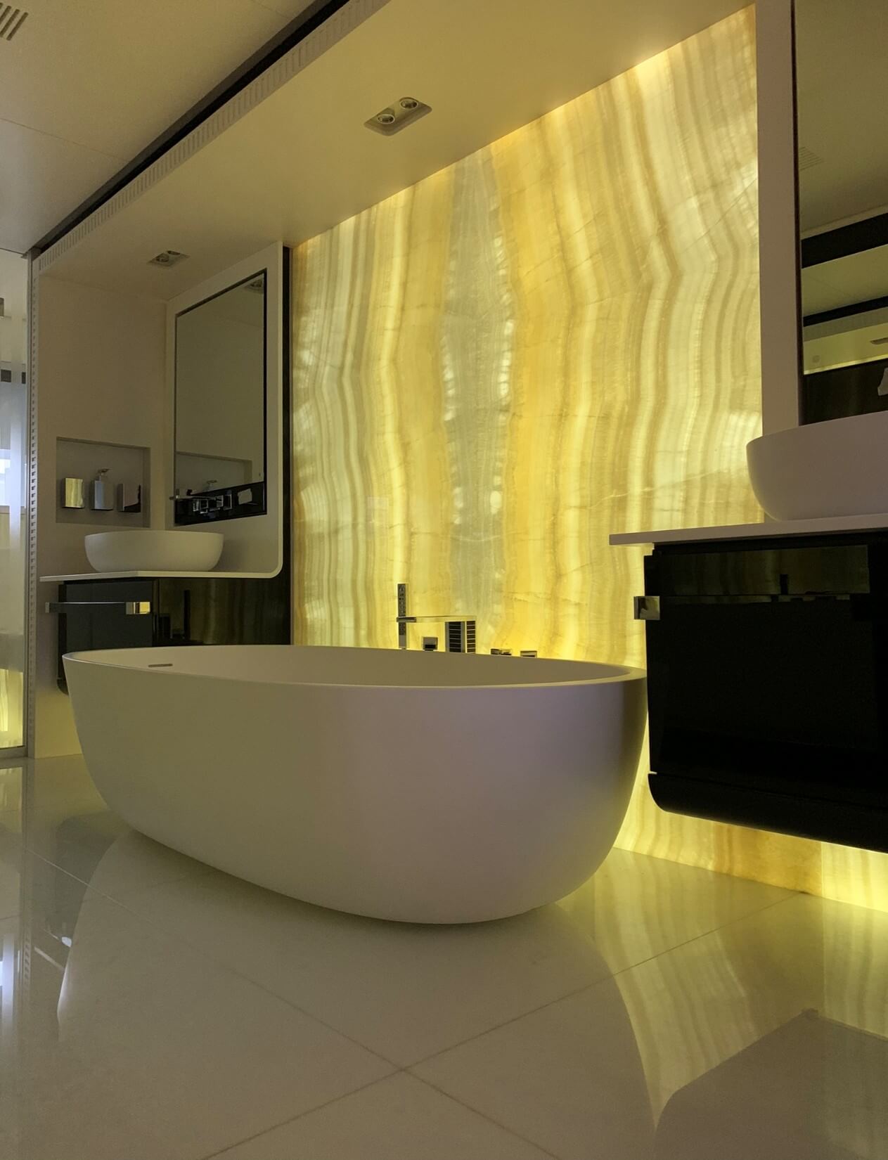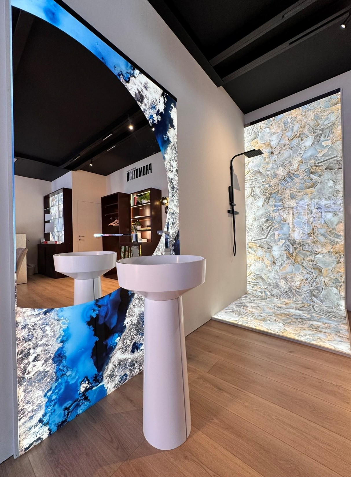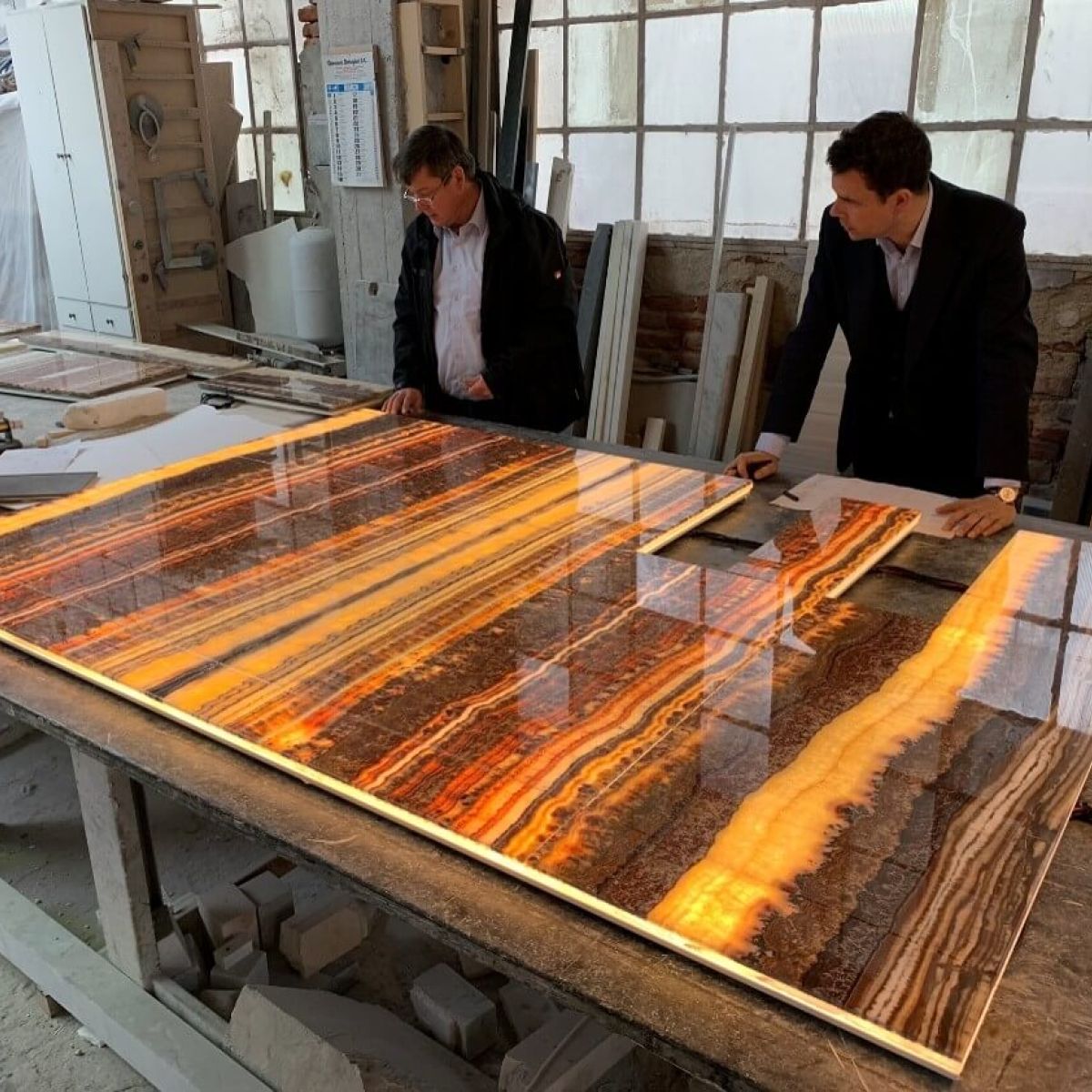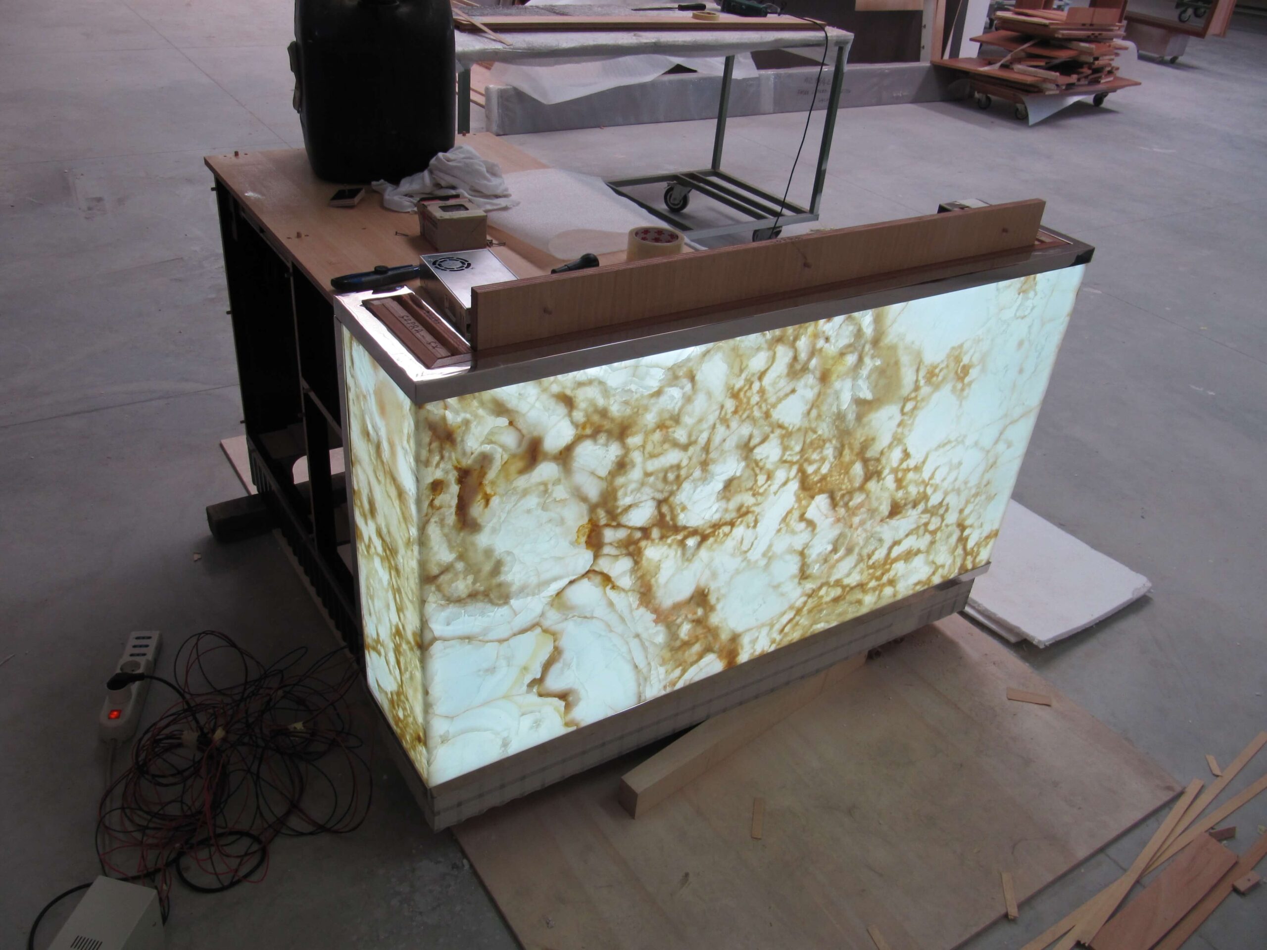 Natural and semi-precious stones such as marble, agate, quartz and onyx, or materials such as glass, decorative wallpaper, artistic mosaics, fabrics, resins and the like, are brought to life by light that passes through them, revealing their most hidden soul.